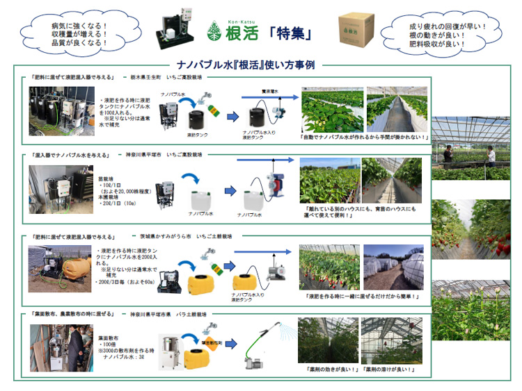 と共同開発した特許技術を使用し、農作物利用に特化した商品の取り扱いをしています。オンリーワンの「気液二相流旋回方式」で低コスト、かつ高濃度のナノバブル水を製造することが可能な技術です。